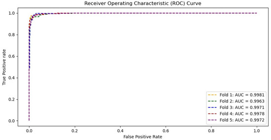 Receiver operating characteristic (ROC) curves for the Residual-Shuffle-Net with its respective area under the curve values.