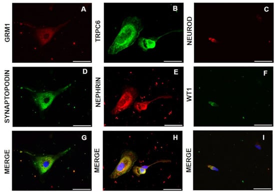 We selected genes characteristic of differentiated podocytes: NPHS1, NPHS2, SYNPO, and WT1 [20,23,26]. In addition, as markers particularly involved in podocyte functionality, we considered and detected TRPC6, GRM1, and NEUROD.