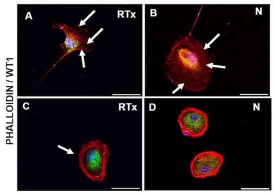 Cytoskeleton remodelling. Actin detected by phalloidin staining (red) shows different distribution in urinary cells of both N and RTx. WT1 nuclear staining identifies the podocytes (green); Podocyte with actin bundles aligned in the cytoplasm (A,B); other podocytes with altered appearances with round shapes, thickened actin bundles at the cell boundaries, and limited cytoplasmic stress fibers (C,D) DAPI (blue) nuclear staining shows the absence of apoptosis. Scale bar is 100 µm.