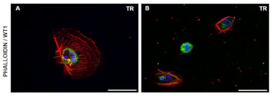 Actin distribution. Stress fibers (red) are visible in podocytes as dorsal, ventral, and transverse arcs (A), or disrupted and distributed along the edge of the cell and poorly expressed in the cytoplasm. (B) Double staining with nuclear podocyte marker WT1 (green) to demonstrate podocyte staining and DAPI (blue) nuclear marker. Scale bar is 100 µm.