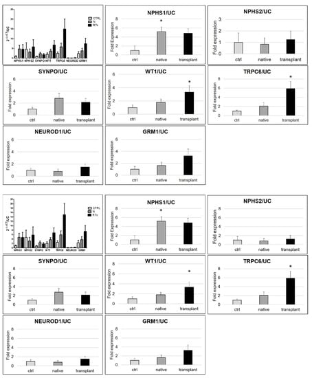The mRNA quantification, relative to the housekeeping gene of the tested genes, demonstrated that TRPC6, GRM1, and WT1 are the most expressed genes in urinary cells of N and RTx (Figure 4, first image top left)