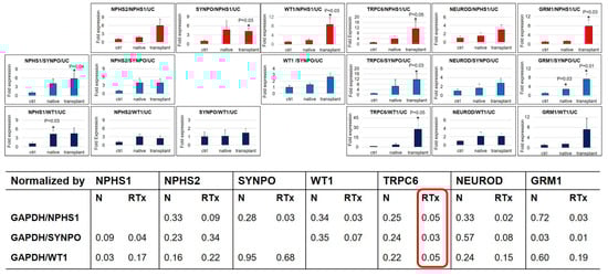 After correcting to NPHS1, we found an increase of all the considered markers in RTx, with a significant rise of SYNPO, WT1, TRPC6, and GRM1, and a strong tendency of SYNPO to increase expression in N.
