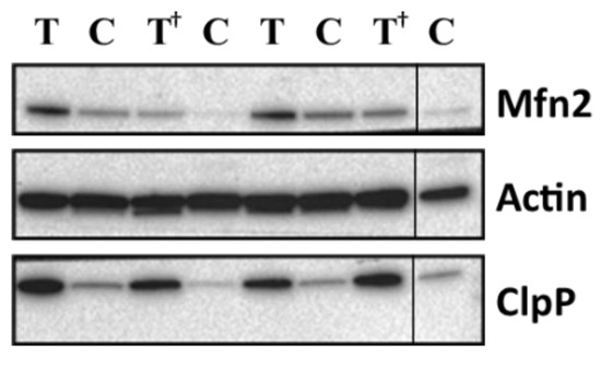 Representative western blotting of Mfn2 and ClpP proteins in bladder tissues. Proteins levels are referred to Actin content (loading control). T, lesional tissue (Tumor); C, adjacent non-lesional tissue (Control). †, high-risk NMIBC patients. The grouping of blots is cropped from different parts of the same gel.