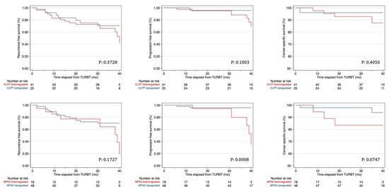 Recurrence-free survival (RFS), progression-free survival (PFS), and cancer-specific survival (CSS) of patients with proteins downregulation (below the cut-off) and upregulation (above the cut-off) were estimated non-parametrically using the Kaplan-Meier method, with differences being tested for significance using the Log-rank test.
