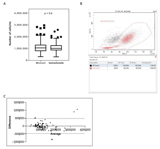 In order to compare the WBC isolation efficiency of the newly semiautomatic system, we measured the count of white cells isolated from matched PB samples via manual and semiautomatic platforms (Table 2). We observed similar isolation efficiency between the methods, with the count results reported as cells/mL. The median cell count obtained was 1.137 × 106 (range 3.23 × 105–3.07 × 106) with the manual method and 1.076 × 106 (range 3.00 × 105–2.78 × 106) with the semiautomatic platform (Table 3). Interestingly, the isolation efficiencies of the two methods were not statistically different (Figure 3A). Moreover, we confirmed that counting cells on the cytoflex system provided information on samples quality compared to their matched manual-count samples. In fact, more accurate counts in the cytoflex platform were obtained observing the scatter distribution of the cell population and modifying the counting-gate (Figure 3B). Overall, we found a 100% of concordance in all patients. The Bland–Altman plot showed no consistent bias between the manual and semiautomatic methods (Figure 3C)