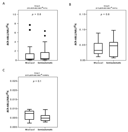 Consolidated data has established that the correct interpretation of serial BCR-ABL1/ABL1IS values depends on the accuracy of the used method [9,35]. Variables of different procedure may affect the reliability of individual assays, interfere with the measurement of BCR-ABL1/ABL1IS transcript and produce different values for scoring molecular response. Therefore, we compared the Q-PCR data obtained by the manual and the semiautomated platforms to investigate whether similar BCR-ABL1/ABL1IS values can be reliably measured. To this purpose, we first stratified the CML patients according to their BCR-ABL1/ABL1IS transcript value into four groups (Group A, B, C and D) and then we compared Q-PCR measurements obtained from matched samples. Overall, measured BCR-ABL1/ABL1IS transcript levels, BCR-ABL1 transcript copy numbers (data not shown) and ABL1 control gene copies revealed a good concordance between the two platforms. By considering the BCR-ABL1/ABL1IS, we observed that matched samples obtained a similar “IS” score and the patients were assigned to the same group of molecular response. Specifically, we observed that in Group A the BCR-ABL1/ABL1IS medians were 0.32180% (range 0.1088–7.655), for the samples performed with the manual methods and 0.42102% (range 0.1022–6.3447) for the semiautomatic platform (Figure 4A; p = 0.6). In Group B, the BCR-ABL1/ABL1IS medians were 0.0338% (range 0.012–0.090) using the manual technologies and 0.04588% (range 0.011–0.099) by the semiautomatic instrument (Figure 4B; p = 0.8). Patients recruited in Group C showed a median BCR-ABL1/ABL1IS of 0.008% (range 0.0037–0.009) when processed with the manual platform and median of 0.005% (range 0.0038–0.009) with the Biomeck i-5 system (Figure 4C; p = 0.1). Both methods gave a BCR-ABL1/ABL1IS undetectable for individuals in Group D (data non shown). The Bland–Altman plot showed no consistent bias between the manual and semiautomatic methods (Figure 5A–C).