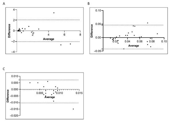 To evaluate the bias between the mean differences of the two methods and to estimate an agreement interval within 95% interval, a Bland–Altman plots was used.