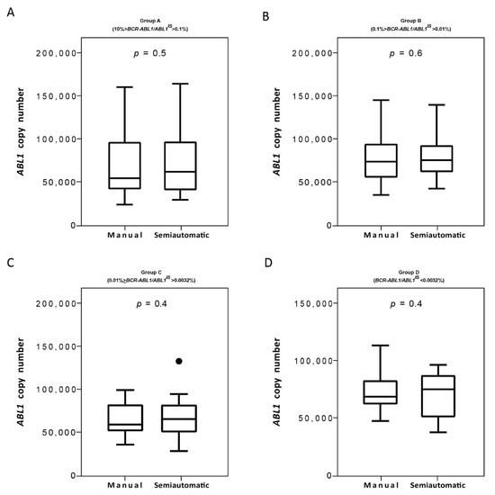Measurement of ABL1 control gene on samples processed with the manual and semiautomatic protocols. Molecular measurement of ABL1 transcripts levels by Q-PCR of matched blood samples processed with a manual or a newly semiautomatic method. ABL1 reference gene copies were measured the four groups of patients stratified, each consisting of 25 subjects: Group A (10% > BCR-ABL1/ABL1IS > 0.1%) (A), Group B (0.1% > BCR-ABL1/ABL1IS > 0.01%) (B), Group C (0.01% > BCR-ABL1/ABL1IS > 0.0032%) (C) and Group D (BCR-ABL1/ABL1IS < 0.0032%) (D). ABL1 levels were determined for each method and depicted as boxplots delimited by the 25th (lower) and 75th (upper) percentile. Horizontal lines above and below each boxplot indicate the 5th and 95th percentile, respectively. Thick lines in each boxplot represent median ABL1 in each patient group. The Wilcoxon signed-rank test was used to test the difference between the platforms. The symbol ● indicate the manual and the semiautomatic method, respectively. p value below 0.5 was considered statistical significant.