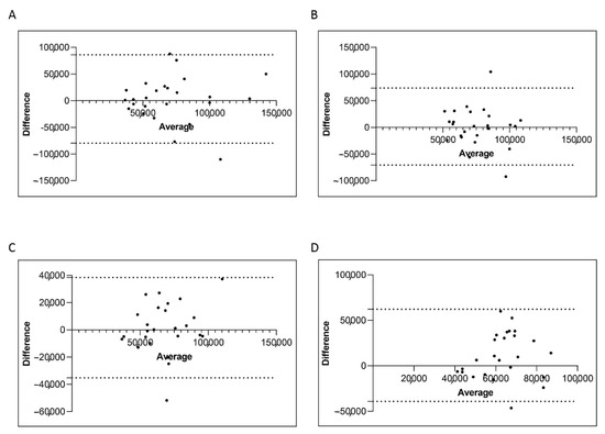 Next, we evaluated the ABL1 reference gene copies and we found that both isolation methods performed optimally with the ABL1 gene copies measured >10,000 in all the four groups (Figure 6A–D). Moreover, we do not observe statistically significant differences in the ABL1 gene copies of patients stratified for both the two platforms. Overall, we found a 100% of concordance. The Bland–Altman plot showed no consistent bias between the manual and semiautomatic methods (Figure 7A–D).