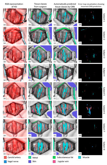Automatic tissue recognition visualization: Visualization of automatic tissue recognition results from the CNN (convolutional neural network) model. In each row, we show images from subjects 1–8. From left to right, in columns, we show the RGB image simulated from HS (a), the ground truth classifications from the surgeon (b), the predicted classifications from the CNN (c) and the error map (d). Black pixels in the error map indicate a perfect classification (no error). Colored pixels indicate an incorrect classification, and the color provides the incorrect prediction.