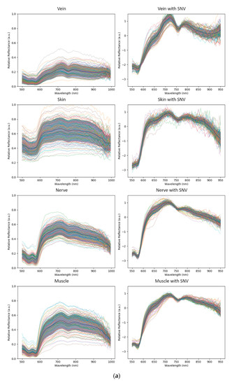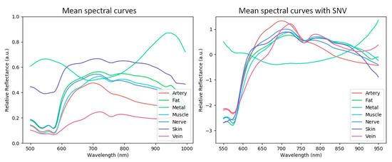 Before applying machine learning, a qualitative analysis of the spectral curves of each tissue class was performed to understand the intrinsic difficulty of the recognition problem. These curves are plotted in Figure 2 and Figure 3, where we show spectral curve distributions for each class with and without the use of SNV normalization. Classes that are easier to recognize by the machine have two general characteristics: (i) low intra-class variation (spectral distribution is similar for the same class) and (ii) high inter-class variation (spectral distribution is different for different classes). Intra-class variation is primarily caused by differences in the same tissue class in different subjects. In Figure 2, intra-class variation is represented by the spectral curve spread (one standard deviation from the mean, illustrated by the gray zone). Inter-class variation is visualized by differences in the mean spectral curves (solid black line). Inter-class variability is tissue-specific, where veins and skin are the most dissimilar tissues. Muscle, nerves and fat are relatively similar, indicating that recognizing them with machine learning is not trivial. The metal class has a strongly different profile compared to the tissue classes. The large intra-class variation of metal can be explained by strong specular reflections.