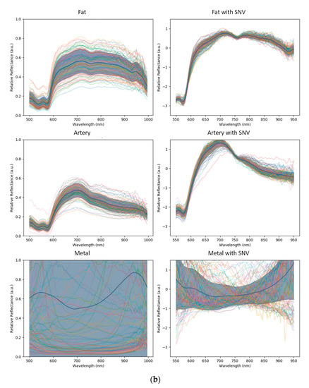 (a) Standard normal variate (SNV) within the classes: Spectral curve profiles of the tissue classes without and with SNV normalization. Relative absorption is plotted as a function of wavelength for each class. The mean spectral curve is shown as a black solid line, and the curve spread is shown with a gray band of one standard deviation from the mean curve. (b) Standard normal variate (SNV) within the classes: Spectral curve profiles of the tissue classes without and with SNV normalization. Relative absorption is plotted as a function of wavelength for each class. The mean spectral curve is shown as a black solid line, and the curve spread is shown with a gray band of one standard deviation from the mean curve. The metal class has a very large spectral distribution because of specular reflections, with a completely different profile to the tissue classes.