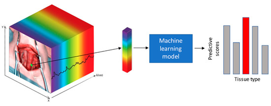 Given a hyperspectral image, for each spatial coordinate (pixel), a sub-volume centered on the pixel is extracted, which is then input to a predictive machine learning model. This model produces a score for each tissue class, where a higher score indicates a greater likelihood of the tissue class being present at the spatial coordinate. Finally, the pixel is assigned to the class with the highest predictive score. This process repeats for each pixel of interest. This machine learning recognition problem is illustrated in Figure 4.