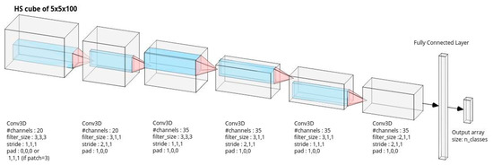 For each HS image in the dataset, we sampled the sub-volume centered on every annotated pixel. Spatial patches of 5 × 5 pixels were extracted to form 5 × 5 × 100 sub-volumes. The third dimension corresponds to the wavelength dimension with the 100 bands. The dataset was then composed of 213,203 samples.