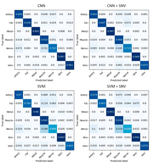 The CNN model achieves a sensitivity of 89.4% and above for all tissue classes except for nerve, which has a sensitivity of 76.3%. Skin tissue has the lowest class confusion among all tissue classes with a sensitivity of 99.7%. Considering the CNN versus the SVM model, the CNN achieves a much higher sensitivity for fat (93.6% versus 78.4%), nerve (76.3% versus 56.4%) and vein (96.1% versus 80.9%) tissues. The remaining classes (artery, skin, muscle and metal) have similar sensitivities within 3% of each other for either model. These results indicate that SNV normalization, in general, harmed the performance of the CNN. Instead of improving performance thanks to a reduction in intra-class variability (for which SNV normalization is designed), it harmed the performance of the CNN because it filtered out useful information that can be exploited by the CNN via deep learning. One can see that this lost information is useful to the CNN to obtain a good classification performance, especially for nerve and vein tissues. Consequently, the CNN model learned useful spatio-spectral features via deep learning that are able to handle inter-class variability without SNV normalization. In contrast, the benefit of SNV normalization on the SVM model is mixed. SNV normalization improves the sensitivity of the vein class with the SVM model (80.9% versus 87.8%), but for the other classes, the sensitivity is similar and within 2% for either model. Therefore, the SVM, which does not learn deep features, can sometimes achieve better results by reducing intra-class variation with SNV normalization, but there is not a systematic improvement for all tissue classes.