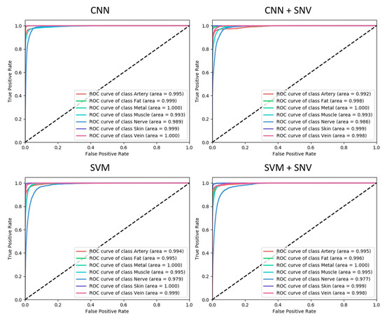 Model performance was further analyzed with receiver operator characteristic (ROC) curves and other performance metrics: Dice similarity coefficient (DSC), sensitivity and specificity. An ROC curve measures the performance of a classifier in terms of false positive and true positive rates. These are generated for each model and for each tissue class as follows. For each class, the prediction scores for all pixels in the test images are computed, and then the false positive and true positive rate is computed using a varying detection threshold. For a lower threshold, a higher false positive rate is obtained, but at the cost of a lower true positive rate. The ROC curve is generated by sweeping the detection thresholds from low (true positive rate of zero) to high (true positive rate of one). ROC curves are plotted for the four models in Figure 7. A high recognition performance is indicated by a high area under the curve (ROC-AUC), and the ROC-AUC summarizes the balance between false positives and true positives, and it is also insensitive to high class imbalance, which is the case with this dataset where some classes, e.g., the skin class, are significantly more represented than others, e.g., the nerve class. The ROC-AUC is also equivalent to the probability that a randomly selected sample will have a higher classification score for its true class compared to other classes. For the CNN model, all ROC-AUCs are above 0.99, which is considered an outstanding performance [56]. For the other models, ROC-AUCs are similar, but the ROC-AUC for the nerve class with the SVM and SVM+SNV models is consistently lower compared to CNN and CNN+SVM.