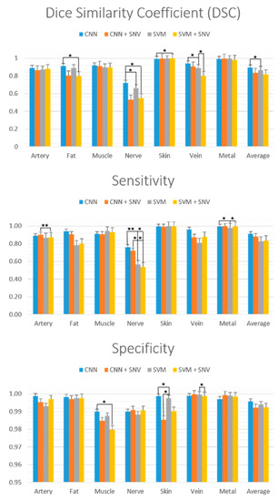 The DCS (also called the Dice coefficient or F1 score), sensitivity and specificity performances of the four models are plotted in Figure 8. These are commonly used performance metrics used in the medical image processing literature. The DCS provides the harmonic mean of a classifier’s precision and sensitivity [57]. Solid bars represent the average performance metric for each model and for each class, computed by averaging the performance metric across each of the 8 images. Error bars represent one standard error. Statistically significant differences were computed with a two-tailed paired t-test (α = 0.05) similarly to previous works in HSI classification analysis [55]. Significance is indicated by the bracketed bars in Figure 8, with one star for p < 0.05 and two stars for p < 0.01. Sensitivity and specificity scores are additionally summarized in Table 1. Regarding the DSC, the CNN model generally has a better average DSC compared to CNN+SNV, but the difference is not statistically significant. In contrast, the CNN model obtains a significantly better DSC performance compared to SNV for the nerve (p = 0.010) and vein (p = 0.044) classes. No other models (CNN+SNV, SVM, SVM+SNV) obtain a significantly better DSC compared to the CNN model. Concerning sensitivity, there are no significant differences between the CNN and CNN+SNV models. In contrast, the CNN model has a significantly better sensitivity compared with the CNN and CNN+SNV models for the nerve class (p = 0.0038 and p = 0.0011, respectively). Concerning specificity, there is no significant difference between the CNN and CNN+SNV models. The CNN model has a significantly better specificity compared to the SVM model for skin tissue (p = 0.021) and a better specificity compared to the SVM+SNV model for muscle tissue (p = 0.036). The DSC, sensitivity and specificity were averaged across all tissue classes, shown in the right-most bars in Figure 4. The CNN model obtains the highest average scores for all three metrics.