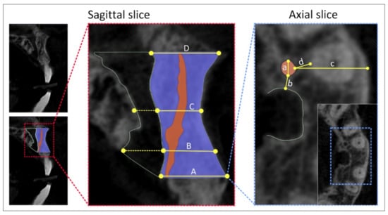 CBCT slices and landmarks of interest. Sagittal cross-section—sagittal CBCT slice (left, upper); slice with marked field of interest (left, bellow); selected landmarks for analyses (right)—(A) the distance between the buccal border of incisive foramen and facial aspect of the buccal bone wall, (B) the distance between the buccal wall of the nasopalatine canal and facial aspect of the buccal bone wall using a horizontal line from the palatal border of the incisive foramen, (C) the distance between the buccal border at the midpoint level of NPC length and facial aspect of the buccal bone wall, (D) the distance between the buccal border of nasal foramen and facial aspect of the buccal bone wall; Axial cross-section—axial CBCT slice (right); (a) the diameter of AC, (b) the distance between AC and NPC, (c) the distance between AC and facial aspect of the buccal bone wall, (d) the distance between AC and central incisor root.
