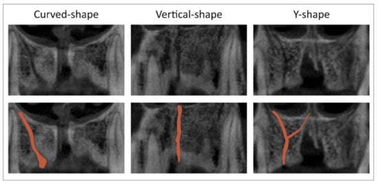 Using a sagittal slice, we estimated four types of NPC shapes following the previously defined classification [], at predefined anterior maxilla levels (Figure 1) as recently described []. ACs’ evaluation was performed by using sagittal, coronal, and axial slices, as follows: