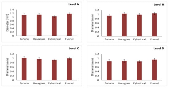 As shown in Figure 3, the maximal diameter of the AC was not significantly affected by NPC shape at all (A, B, C, and D) estimated levels (df = 3, F = 0.738, 0.498, 0.352, and 0.329, respectively). The mean maximal AC diameter was approximately 1 mm for all levels. Although the maximal diameter was slightly above the mean value on the level A, while on the other hand the lowest maximal diameter was observed at the level D, there was no significant difference for this parameter.