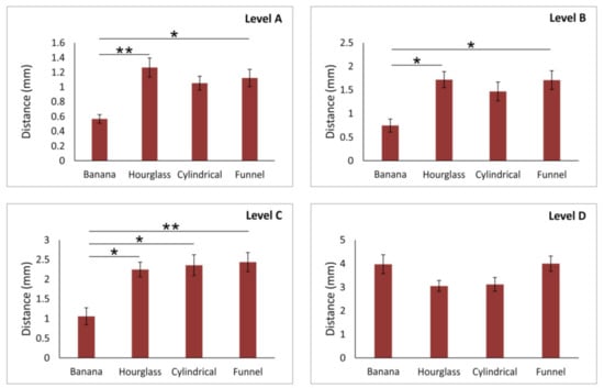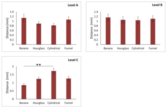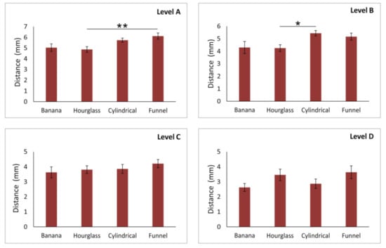 However, the analysis presented in Figure 4 confirmed that the distance of the AC from the NPC was significantly influenced by NPC shape, except on the level D (df = 3, F = 2.946). Therefore, the impact of NPC shape on AC distance from the NPC was confirmed at the levels A, B, and C (F = 4.507, 3.717, and 4.617, respectively) The distance between the AC and NPC in the banana-type NPC was significantly lower in comparison to both hourglass- (p < 0.01 at level A, and 0.05 at level B) and funnel-type (p < 0.01 at both levels A and B). The most robust impact of NPC shape on AC-NPC distance was present at the level C where the distance from the NPC observed in the banana-type was also significantly reduced when compared to the cylindrical-type of NPC (p < 0.05).