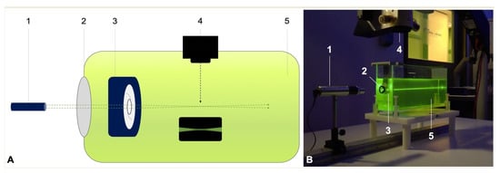 Experimental set-up for direct visualization of the light scattering effects. (A) Schematic illustration, (B) in vitro optical bench set-up. To elaborate, 1 = monochromatic green laser light source (532 nm); 2 = model cornea; 3 = intraocular lens holder; 4 = surgical microscope with an integrated digital camera; and 5 = water bath containing 0.01% fluorescein solution.
