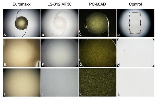 Gross microscopic images of the studied IOLs. (A–D) Overview images, (E–H) images taken with 4-fold magnification, (I–L) images taken with 40-fold magnification.