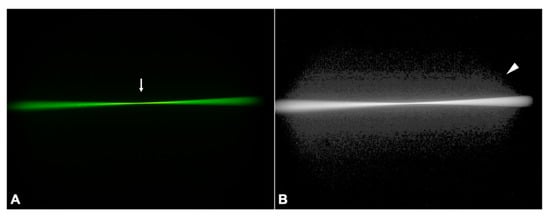 In ray propagation imaging, the monofocal control IOL showed mostly lucent light rays that refracted to one focus (Figure 3A, arrow). Once converted to a log image, a cross-excitation of the medium surrounding the very bright light cone and fluorescein-particle scattering were made visible (Figure 3B, arrowhead).