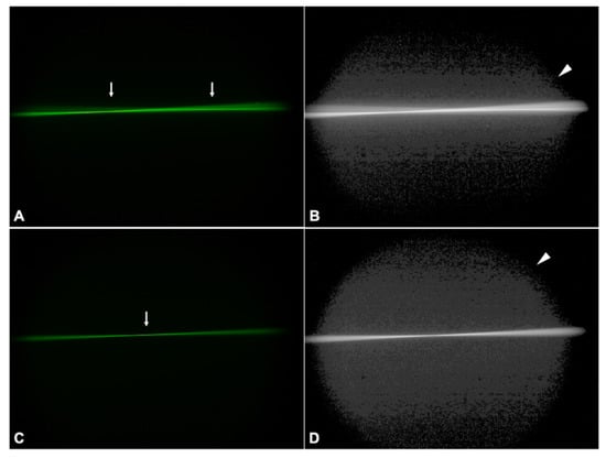 Ray propagation and light scattering of the calcified LS-312 MF30 (A,B) and Euromaxx (C,D) IOL-explants. The arrows indicate the focal point, while the arrowheads point to the scatter light.