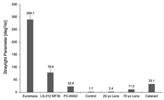 Figure 6 illustrates the straylight of the studied IOLs compared to those of a 20-year-old, 70-year-old, and a cataract lens. The highest amount of straylight was observed in the Euromaxx, followed by the LS-312 MF30. The two IOL-explants’ straylight levels were much greater than those of a cataractous lens. While the straylight levels of the PC-60AD were lower than those of the IOL-explants or the cataract lens, it was considerably higher than those of the control IOL. The control IOL showed the lowest levels of straylight, lower than those of a 20-year-old lens.