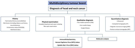 The diagnostic workup is challenging because of the heterogeneity and complexity of HNC [4,5]. Diagnosis remains the art of determining the nature and extent of a disease condition [6]. Clinical decision making in head and neck oncology aims to offer the best management options for the patient. Based on the patient’s medical history, performance and nutritional status, comorbidities, physical symptoms, and signs, and, often, on the results of laboratory tests, radiological imaging, and pathological and molecular investigations [6], the multidisciplinary tumour board (MTB) will thus apply all relevant information that is related either to the patient or the tumour and available treatment modalities to offer the best management options for the patient.