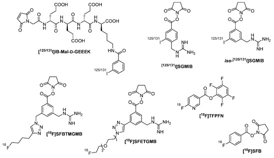 - Choi, J.; Vaidyanathan, G.; Koumarianou, E.; McDougald, D.; Pruszynski, M.; Osada, T.; Lahoutte, T.; Lyerly, H.K.; Zalutsky, M.R. N-Succinimidyl guanidinomethyl iodobenzoate protein radiohalogenation agents: Influence of isomeric substitution on radiolabeling and target cell residualization. Nucl. Med. Biol. 2014, 41, 802–812. [Google Scholar] [CrossRef]