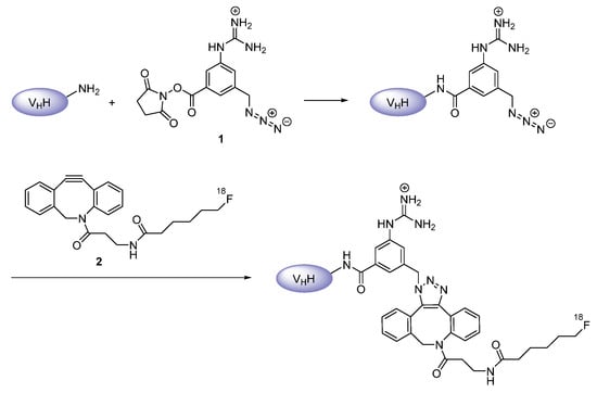 - Zhou, Z.; McDougald, D.; Meshaw, R.; Balyasnikova, I.; Zalutsky, M.R.; Vaidyanathan, G. Labeling single domain antibody fragments with 18F using a novel residualizing prosthetic agent–N–succinimidyl 3-(1-(2-(2-(2-(2-[18F]fluoroethoxy)ethoxy)ethoxy)ethyl)-1H-1,2,3-triazol-4-yl)-5-(guanidinomethyl)benzoate. Nucl. Med. Biol. 2021, 100-101, 24–35. [Google Scholar] [CrossRef] [PubMed]