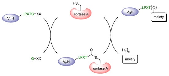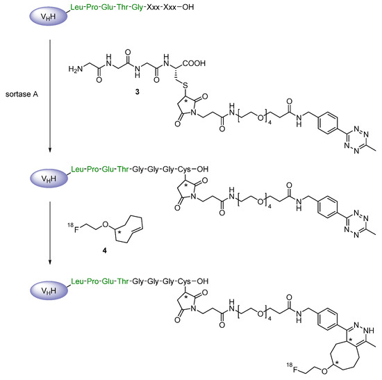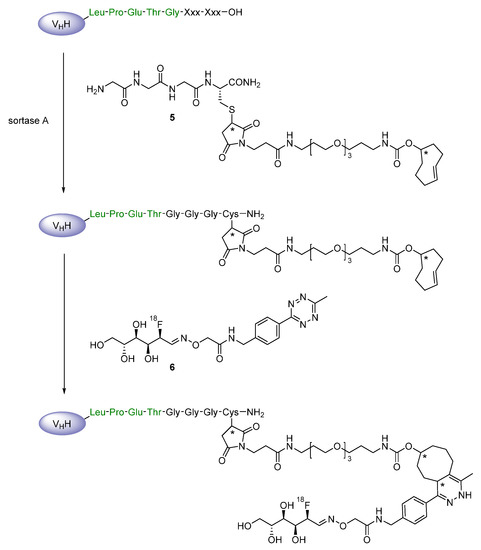 - Massa, S.; Vikani, N.; Betti, C.; Ballet, S.; Vanderhaegen, S.; Steyaert, J.; Descamps, B.; Vanhove, C.; Bunschoten, A.; Van Leeuwen, F.W.B.; et al. Sortase A-mediated site-specific labeling of camelid single-domain antibody-fragments: A versatile strategy for multiple molecular imaging modalities. Contrast Media Mol. Imaging 2016, 11, 328–339. [Google Scholar] [CrossRef]