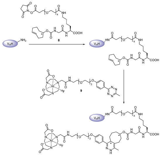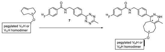- Zhou, Z.; Zalutsky, M.R.; Vaidyanathan, G. Labeling a TCO-functionalized single domain antibody fragment with 18F via inverse electron demand Diels Alder cycloaddition using a fluoronicotinyl moiety-bearing tetrazine derivative. Bioorg. Med. Chem. 2020, 28, 115634. [Google Scholar] [CrossRef] [PubMed]