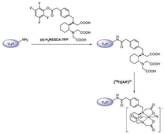 - Zhou, Z.; McDougald, D.; Devoogdt, N.; Zalutsky, M.R.; Vaidyanathan, G. Labeling single domain antibody fragments with fluorine-18 Using 2,3,5,6-tetrafluorophenyl 6-[18F] fluoronicotinate resulting in high tumor-to-kidney ratios. Mol. Pharm. 2019, 16, 214–226. [Google Scholar] [CrossRef] [PubMed]