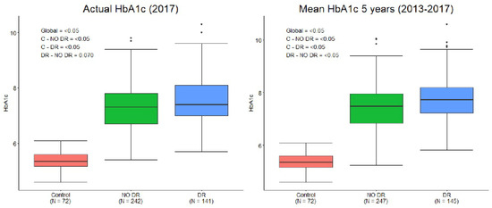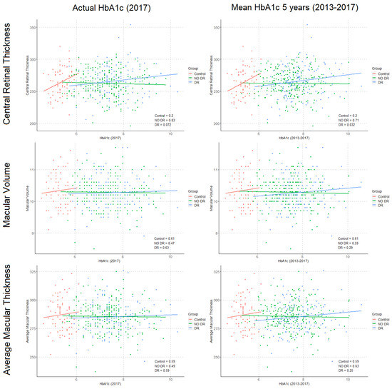 The comparative analysis of HbA1c levels in the study subgroups is presented in Figure 2 and Table 1. The mean actual HbA1c level was significantly lower in controls than DM-no DR and DM-DR (5.37 vs. 7.34 vs. 7.54, p < 0.05), but no differences were observed between DM-no DR and DM-DR eyes (p = 0.07). The mean 5-previous year HbA1c level was also significantly lower in controls than DM-no DR and DM-DR (5.37 vs. 7.46 vs. 7.79, p < 0.05), and was significantly higher in DM-no DR compared to DM-DR patients (p < 0.05). All these results were still significant after adjusting for age, sex, scan quality, DM duration, and axial length.