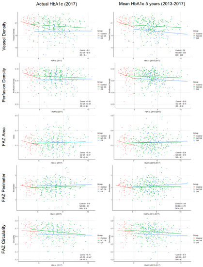Correlations between glycated haemoglobin (HbA1c) levels and optical coherence tomography angiography (OCTA) parameters in study subgroups. Left: OCTA parameters and actual HbA1c level at the retinal imaging timepoint (2017). Right: OCTA parameters and Mean HbA1c calculated from previous 5 years timepoints (2013 to 2017). (Numerical values represent the p-value of correlations, p-values are adjusted by age, sex, signal strength index, diabetes mellitus duration, and axial length).