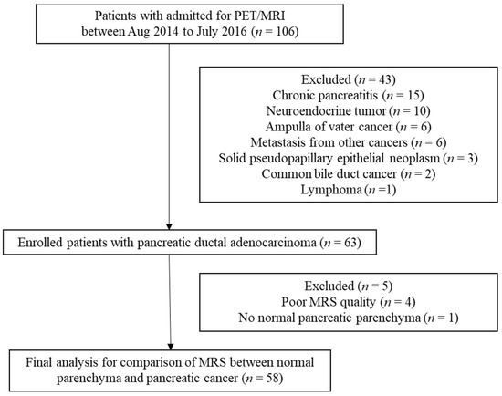 From August 2014 to July 2016, 106 consecutive patients were admitted for examination by PET/MRI before treatment. The inclusion criteria were suspicious pancreatic cancer on sonography or CT and no local or systemic therapies. The exclusion criteria were pregnancy and contraindications for MRI. All the patients’ pathologies were proven by surgery, endoscopic ultrasound, or CT-guided biopsy. Tumor size, histological grade, and lymph node metastasis data were recorded. The TNM stages (American Joint Committee on Cancer, 7th edition) of the study patients were determined by a multidisciplinary team for pancreatic cancer at our hospital. Finally, 58 patients (mean age 62.7 ± 12.1 years, range 34–81 years; 36 men, 22 women) with pancreatic ductal adenocarcinoma comprised our study population after excluding 48 patients (chronic pancreatitis, n = 15; other malignancy, n = 28; poor MRS quality, n = 4; and no normal pancreatic parenchyma identified, n = 1) (Figure 1). Patient characteristics are presented in Table 1.