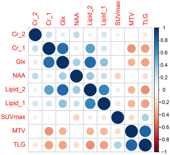 TLG showed moderate inverse correlations with Cr_1 (rho = −0.418, p = 0.001), Glx (rho = −0.405, p = 0.01), lipid_2 (rho = −0.454, p = < 0.001), and lipid_1 (rho = −0.415, p = 0.001).