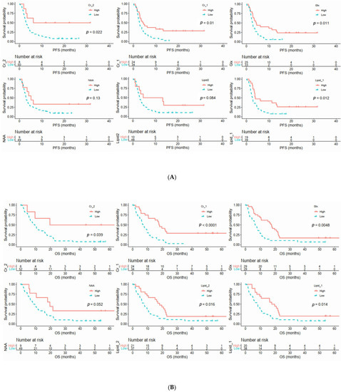 Kaplan–Meier curves of MRS metabolites of PFS (A) and OS (B).