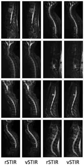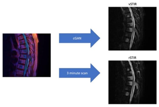 The spine is one of the body regions that is the most frequently examined in MRI. Reasons for MRI are mainly back pain, sensitivity impairments, and paralysis [1,2]. To visualize the most common pathologies, short tau inversion recovery images (STIR) are often used, along with T1- and T2-weighted images. The STIR contrasts are particularly useful in the diagnosis of acute pathologies, such as inflammation or acute vertebral fractures. In the example of a vertebral body fracture, STIR is used to detect a vertebral edema and thus often enables a therapy-relevant differentiation between new and old fractures. Apart from that, the STIR sequence can lead to the decision of whether a contrast agent administration is required [3]. This is especially important considering the continuously increasing number of MRI examinations worldwide [4]. However, the acquisition of STIR sequences requires a significant amount of scanning time of three minutes [5] and is therefore susceptible to motion artifacts. In recent years, the introduction of new techniques based on deep learning has enabled advances in image processing that were previously widely considered impossible. For image processing, the use of generative adversarial networks (GAN) has become the predominant approach. As a result, it could be demonstrated that GANs are highly effective in CT denoising [6] and in inserting virtual contrast media in non-contrast MRI [7].