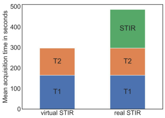 To calculate the time saved by generating the vSTIR sequence, the acquisition time of the T1, T2, and STIR sequences was extracted from the DICOM header. The acquisition of the STIR sequence took 188.5 ± 46.7 s, on average, in comparison to 164.6 ± 48.1 s of T1 scan time and 132.2 ± 40.3 s of T2 scan time (Figure 4 and Figure 5).