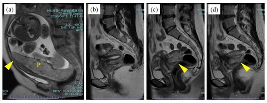 Case 13, conceived by assisted reproductive technology, was strongly suspected to have severe adhesion of the Douglas’s pouch as a result of a previous history of peritonitis, an operation for endometrial ovarian cysts, and a tubal pregnancy. MRI showed placenta previa at the cranioventrally stretched internal cervical ostium at 33 weeks of gestation (Figure 2a); however, it was difficult to diagnose the adhesion behind the uterine cavity. A cesarean delivery was performed because of increased uterine contractions at 34 weeks of gestation. MRI after the delivery showed signs of adhesion [10], a retroflexed uterus, an elevated posterior vaginal fornix, and loss of the fatty layer at the posterior cul-de-sac between the posterior uterine wall and the rectum (Figure 2b–d).