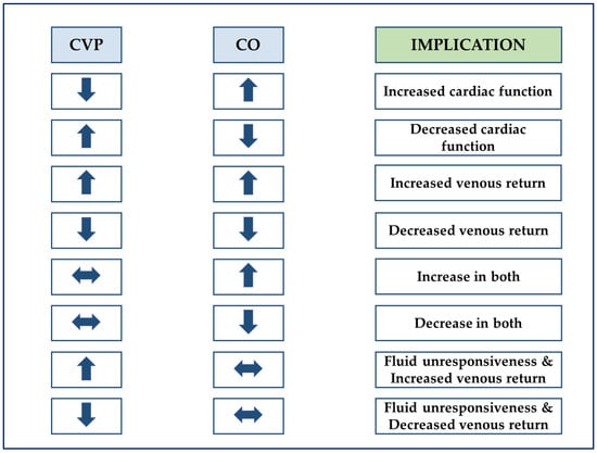 Interpretation of coupled changes in cardiac output and central venous pressure. CO, cardiac output; CVP, central venous pressure. Adapted with permission [37].
