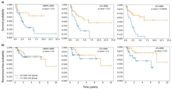 For OS, all three models achieved a significant stratification (UMAP + ANN p = 0.01; LO + ANN p = 0.01) although the separation of the two groups was more evident for the LP + ANN model (p < 0.001). For LRF, the LP + ANN model was the only one able to significantly divide the testing patients into high-risk and low-risk groups (p = 0.03). The UMAP + ANN model (p = 0.8) and LO + ANN (p = 0.4) showed worse performance in stratifying patients (Figure 1).