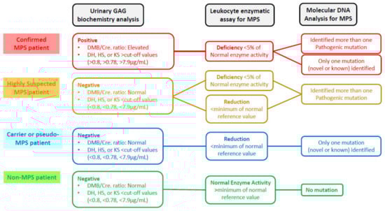 - Lin, H.Y.; Lee, C.L.; Lo, Y.T.; Tu, R.Y.; Chang, Y.H.; Chang, C.Y.; Chiu, P.C.; Chang, T.M.; Tsai, W.H.; Niu, D.M.; et al. An At-Risk Population Screening Program for Mucopolysaccharidoses by Measuring Urinary Glycosaminoglycans in Taiwan. Diagnostics 2019, 9, 140. [Google Scholar] [CrossRef]