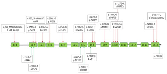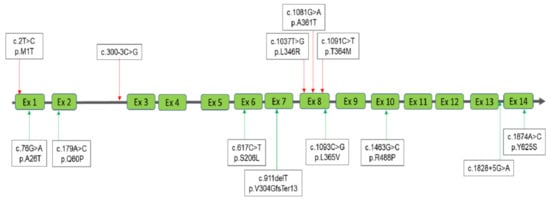 - Yang, C.F.; Tsai, F.J.; Lin, S.P.; Lee, C.C.; Wu, J.Y. A novel in-frame deletion mutation (c106-111del) identified in a Taiwan Chinese patient with type IVA mucopolysaccharidosis. Hum. Mutat. 2001, 18, 254. [Google Scholar] [CrossRef]