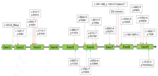 A total of 21 mutations of the IDS gene underlying Taiwanese Hunter syndrome were found; of those 17 had been reported previously (red lines with arrows) and the other four were novel mutations (green lines with arrows).