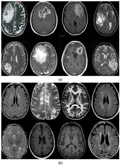 (a) describe T1, T2-weighted, and FLAIR MR brain images with tumor and (b) describes T1, T2-weighted, and FLAIR MR brain images without the tumor.